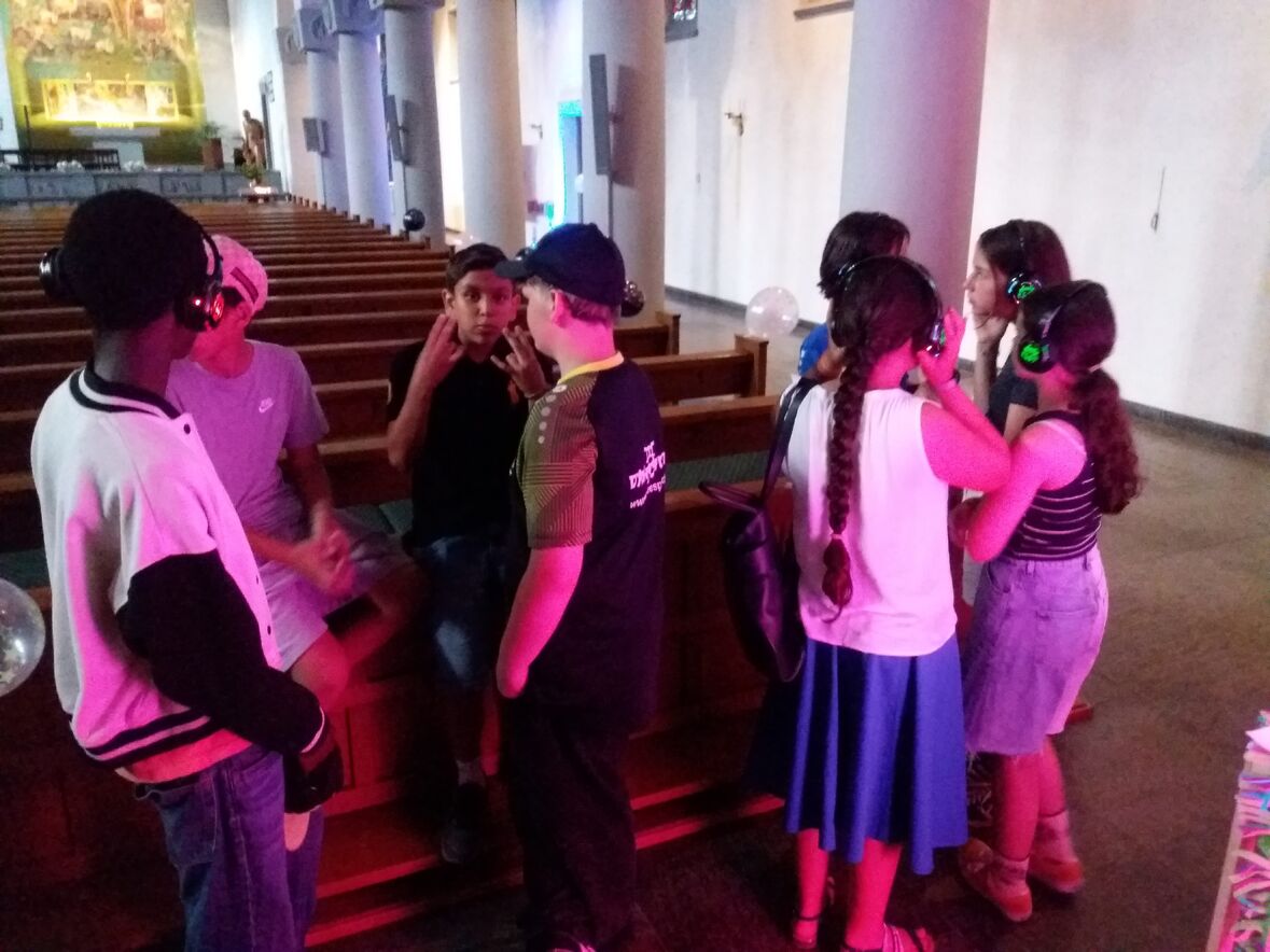 Rund 50 Jugendliche trafen sich in der Dreifaltigkeitskirche Heiligkreuz um den Start der Sommerferien zu feiern. Bei der Silent Disco erhält jede Person einen Kopfhörer auf dem sie direkt zwischen drei Playlists auswählen kann. An den farbigen Lichtern an den Kopfhörern ist zu sehen wer auf welcher Playlist ist, so sieht man wer zum gleichen Lied tanzt wie man selbst.